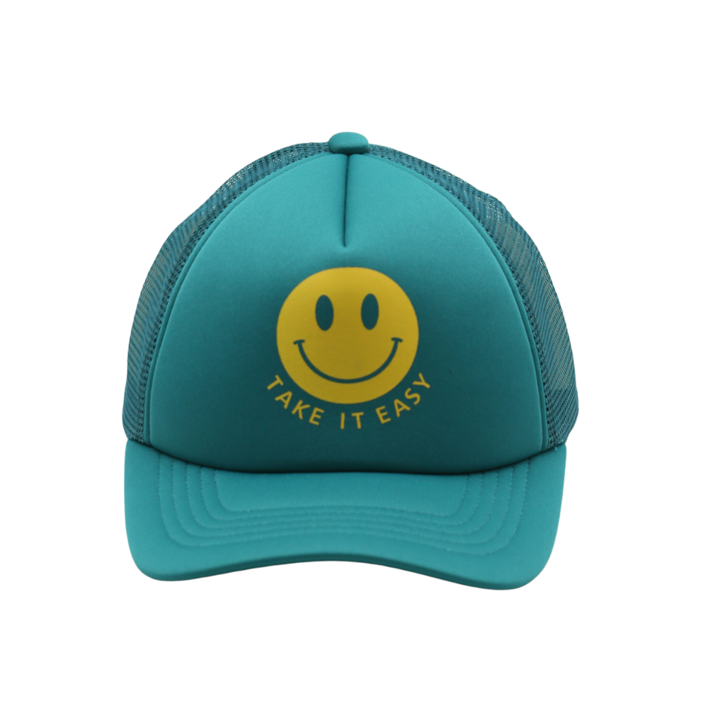 Take It Easy - Smiley Face Trucker Hat – Teal Mesh Snapback Cap for Women